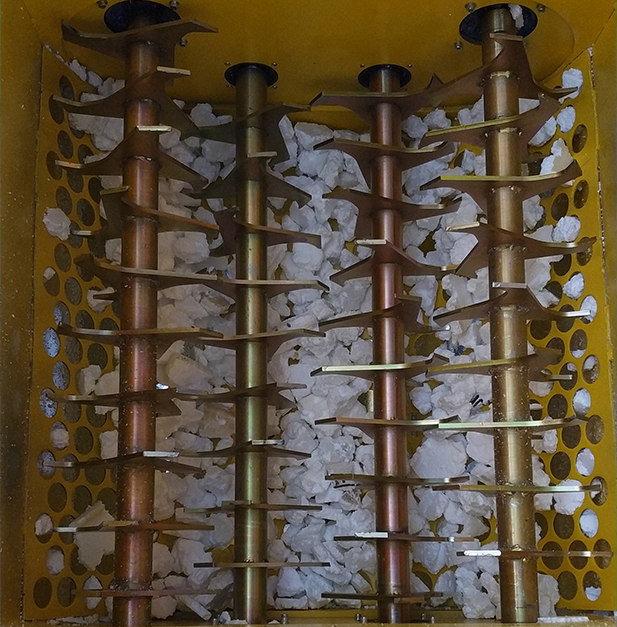 CF-HM400型号的热熔机采用四轴破碎刀片、四排平行的刀片轴对称地固定在刀片上,刀片在双轴刀片轴上错位排列,各轴上的刀片通过计算的方法均匀地布置在同一方向。每一轴上的第一个刀片和最后一个刀片都成90度角。当四轴破碎刀片开始工作时,两个平行的刀片轴以不同的旋转方向进行旋转,形成一个波浪的控制,这样材料就可以恒定的速度向下移动,在经过切割刀片的切割后,会变成更小的块状。EPS热熔机里的四轴破碎刀片可以把EPS料变成更小体积的块,然后通过滤网。这些不能通过滤网再次被破碎的料会最终通过滤网过滤掉。该材料将由高速旋转螺杆推送到加热筒。主机的螺杆可以输送、加热料,使其达到热熔状态,然后挤出并通过液压切刀将其切成一块一块的,更加便于贮存和运输。