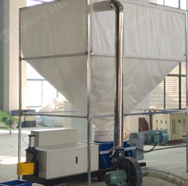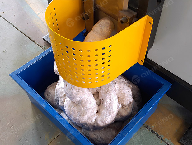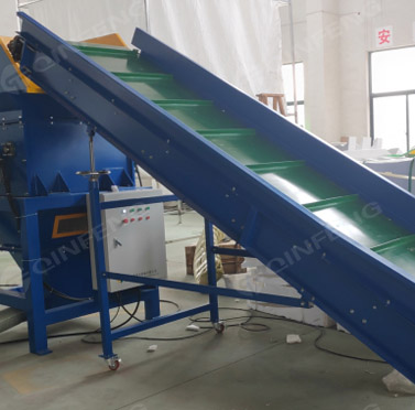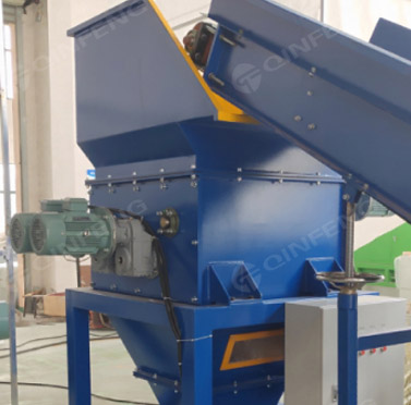 4轴破碎刀片工作时,两个不同旋转方向的平行刀片轴开始旋转,形成波浪向下夹持,使物料不断向下运动,经过切割刀片后,破碎成更小的块状物质 . 然后风机输送将物料吹入料仓,储存一定量,然后物料在热熔机中熔化。
